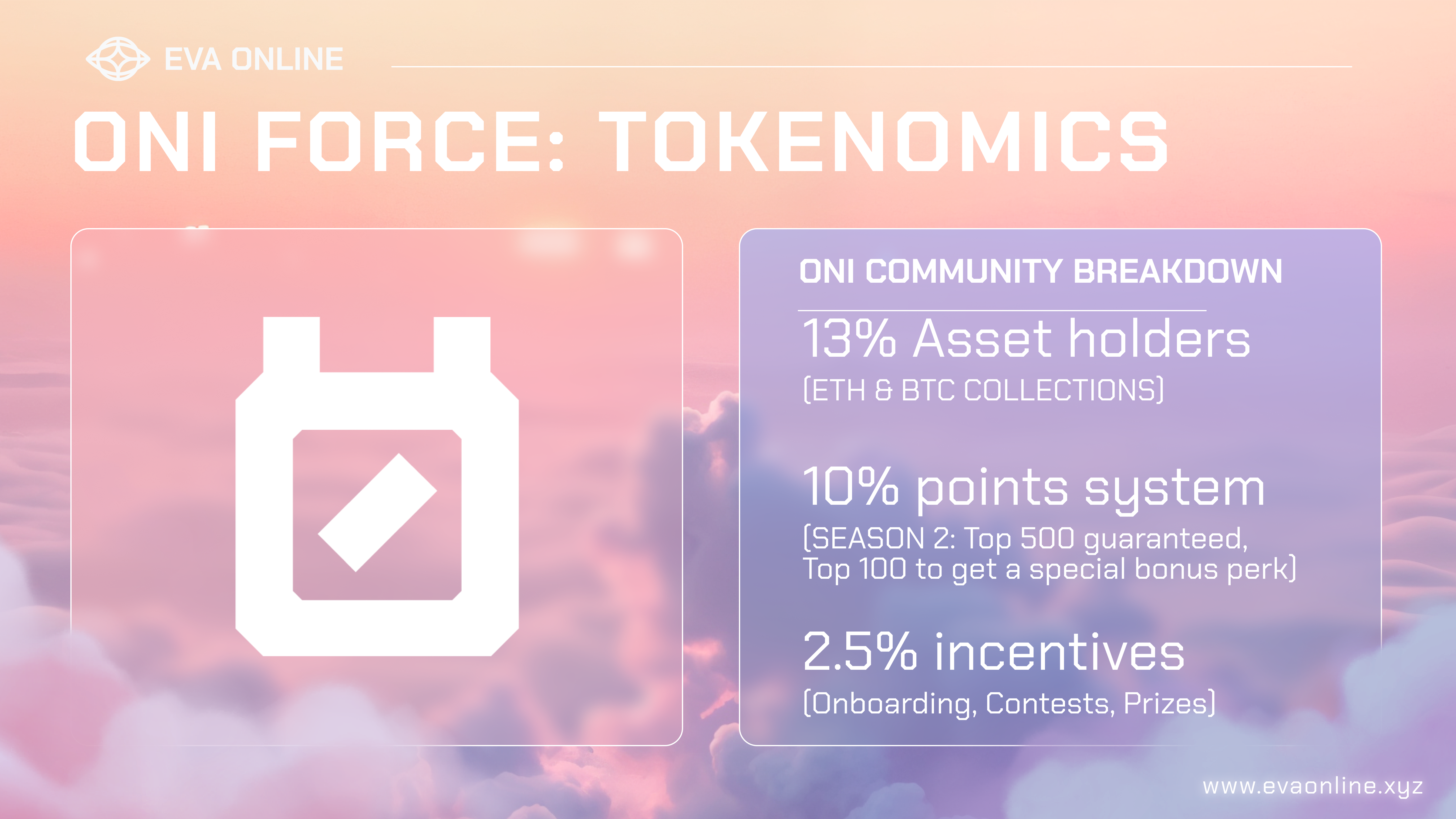 <figure><img src="https://430222820-files.gitbook.io/~/files/v0/b/gitbook-x-prod.appspot.com/o/spaces%2FQFYwEHtKyaXeC6LLLbBT%2Fuploads%2FIVdXa2Ge330h8ui7hRw6%2FEVA_oni%20tokenomics.png?alt=media&#x26;token=947067dc-5389-4208-8b97-e1145f8d39bb" alt=""><figcaption></figcaption></figure>